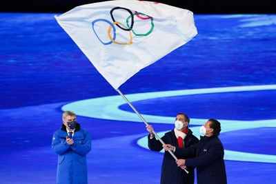 По традиции в середине церемонии закрытия был спущен олимпийский флаг. Мэр Пекина Чен Цзинин (Chen Jining) передал его Томасу Баху, из рук которого флаг получили коллеги г-на Чена — мэры итальянских городов Милан и Кортина д’Ампеццо — Беппе Сала (Beppe Sala) и Джанпьетро Гедина (Gianpietro Gedina). Они вместе примут следующие Зимние игры, получившие название «Милан Кортина-2026».