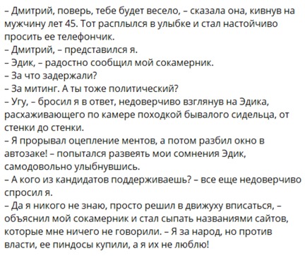 Исходя из диалога следует, что некий Эдик, заскучав от повседневной жизни, пришел на митинг, чтобы «вписаться в движуху». Ни о каких политических единицах сокамерник Гудкова до этого никогда не слышал. Поэтому, чтобы не терять времени зря, несостоявшийся кандидат в депутаты решил просветить своего новоиспеченного друга по несчастью.
