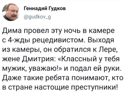 Гудков-младший в Telegram рассказал о своем диалоге с сокамерником, который произошел во время отбывания административного ареста. За плечами Эдуарда, соседа Гудкова по камере, 13 лет заключения за разбои и грабежи. Причиной ареста сокамерника экс-кандидата стал прорыв оцепления во время незаконной, а также хулиганство в автозаке.