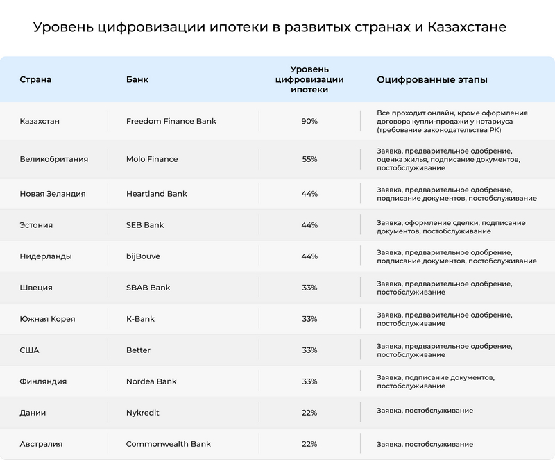 Казахстан занял первое место в рейтинге топ-11 стран по цифровизации ипотеки. Согласно исследованию, Bank Freedom Finance Kazakhstan удалось оцифровать получение ипотечного займа на 90 %.