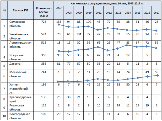 Преступления, связанные с незаконными врезками в магистральные трубопроводы регулярно раскрывают по всей стране: в Московской, Ленинградской, Тульской, Рязанской и других областях. Самая вопиющая картина сложилась в Московской области – за 10 лет количество врезок в регионе увеличилось в 59 раз! В Ленинградской области – выросло почти на треть. Как менялась ситуация в стране последние 10 лет, видно из таблицы ниже.