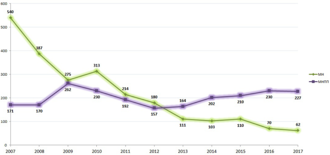 В Ленинградской области, которая занимает третью строчку рейтинга, борьба с бутлегерами то демонстративно возбуждается, то тихонько затухает – это видно из графика и подтверждается фактами. В 2017 году число врезок снизилось до 52 случаев. Летом того же 2017 задержали начальника Киришской полиции, о котором мы упоминали в начале статьи. А он, похоже, многих «покрывал». Перестал «покрывать» — перестали воровать, точнее «затаились». Не посадили бы, Ленобласть шла бы на рекорд – третий год стабильного роста!