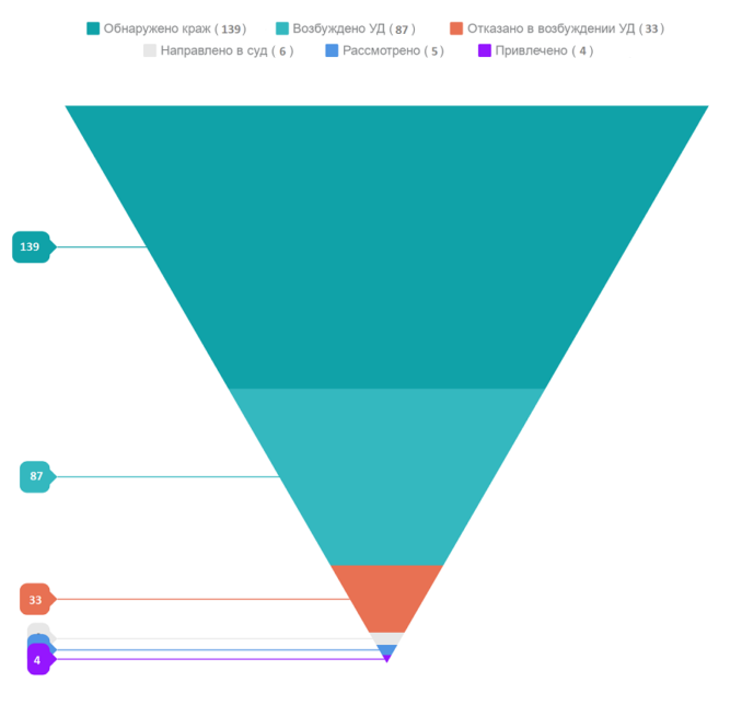 Обратимся к статистике: За последние три года в Подмосковье зафиксировано 139 фактов краж топлива. По ним возбуждено 87 уголовных дел, при этом отказано в рассмотрении почти трети от этого числа – 33. В суд направлено только 6 эпизодов, из них рассмотрено — 5, преступники привлечены к наказанию по 4 делам.