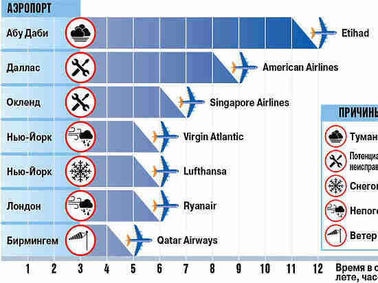 Например, пассажиры Etihad провели целых 12 часов в самолете, который не мог улететь из аэропорта Abu Dhabi из-за непроглядного тумана. А клиенты компании American Airlines просидели 9 часов в креслах самолета в ожидании вылета из воздушной гавани Dallas. Пассажиры Singapore Airlines провели порядка 8 часов на борту воздушного судна из-за потенциальной неисправности авиалайнера. Непогода стала причиной задержки вылета и самолета Virgin Atlantic, а также Lufthansa из Нью-Йорка. Ожидание заняло 6 часов.