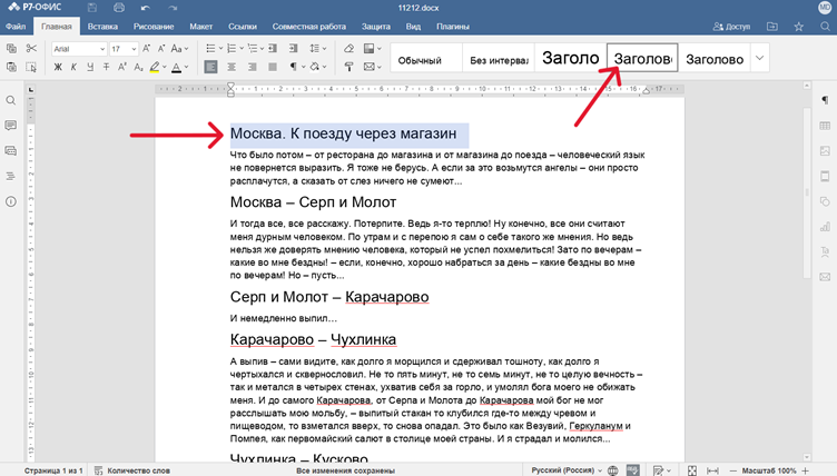 Сначала необходимо добавить заголовки и подзаголовки в текст — «Заголовок 1», «Заголовок 2» и так далее. Чтобы добавить заголовок, необходимо выделить строку, а затем в верхней панели в библиотеке стилей выбрать нужный вариант.