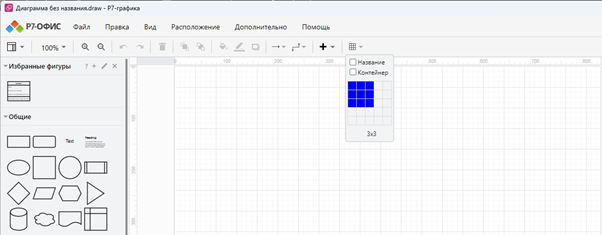 Сначала необходимо зайти в «Р7-Графику» и на панели инструментов нажать на кнопку «Таблица». В выпадающем меню выбрать для будущей таблицы нужное количество столбцов и строк и кликнуть левой кнопкой мыши. Если для таблицы необходим заголовок, при открытии выпадающего меню нужно поставить галочку в окошке напротив функции «Название», а затем уже переходить к выбору нужного количества столбцов и строк. Готово.