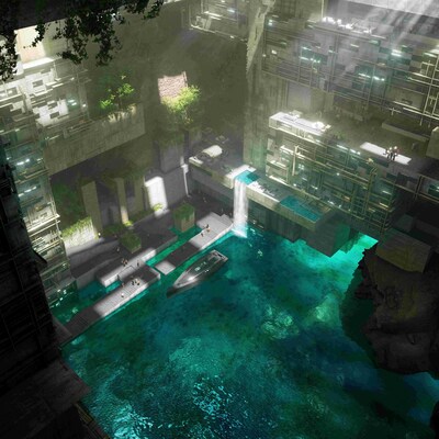 Оказавшихся внутри посетителей ждет захватывающий дух 100-метровый подъем с видом на впечатляющее дворовое пространство, простирающееся от воды до самого неба. Это подземное цифровое сообщество отличают динамизм и возможности взаимодействия: оно органично сочетает отели, апартаменты, торговые пространства, зоны отдыха и развлечений, а также инновационные центры.