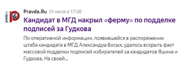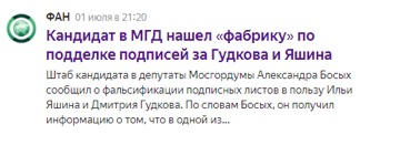 Александр Босых, один из кандидатов в МГД, рассказал о том, что он знает о существовании квартиры, где несколько человек заполняли подписные листы за Илью Яшина и Дмитрия Гудкова. Видеозапись своего заявления Босых разместил на своей странице в Facebook 1 июля в 17:08. На ресурсе ФАН этот материал опубликовали в 21:20, существенно позже.