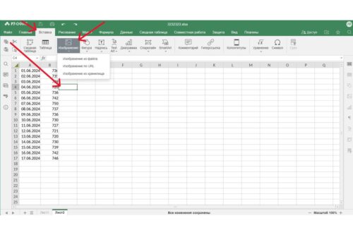 Чтобы вставить картинку в таблицу необходимо установить курсор там, где будет располагаться изображение в таблице. Затем на верхней панели инструментов следует открыть вкладку «Вставка» и нажать на кнопку «Изображение». В выпадающем меню надо выбрать, откуда программе следует загрузить картинку — из файла на компьютере, из интернета по URL-ссылке или из облачного хранилища.