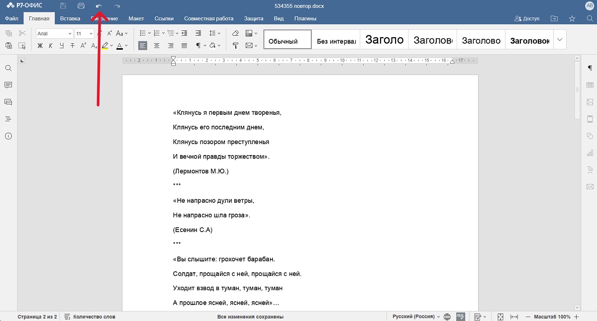 Для того чтобы отменить последнее действие в документе «Р7-Офис», необходимо на панели сверху в левой ее нажать на стрелку слева «Отменить». Для этой же цели также можно использовать сочетание клавиш Ctrl+Z на клавиатуре. Если необходимо отменить не одно, а несколько последних действий, нужно нажать на стрелку или сочетание клавиш Ctrl+Z несколько раз.