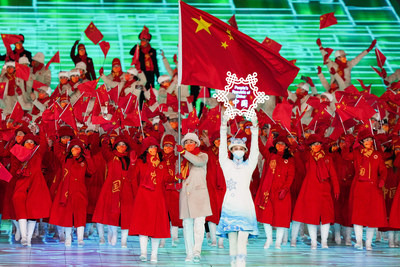 По сложившейся Олимпийской традиции во время парада спортсменов первыми на стадион вошли участники национальной сборной Греции, а вслед за ними — сборная Турции. Последней промаршировала сборная Китая в качестве хозяев Зимней Олимпиады. Китайский национальный флаг пронесли за свою команду конькобежец Гао Тинъюй (Gao Tingyu) и скелетонистка Чжао Дань (Zhao Dan).