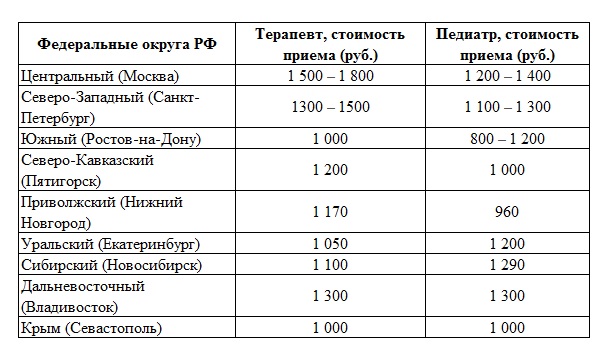 В отдельных округах, например, в Уральском, оказалось, что стоимость приема педиатра примерно на 10% выше цены визита к терапевту. В Крыму и Дальневосточном цена на прием у педиатра и терапевта стоят примерно одинаково.