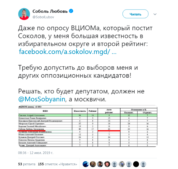 В своем Твиттер-аккаунте юрист так называемого ФБК заявила о своем небывалом рейтинге и причислила себя к двойке лидеров, за которых москвичи якобы хотят отдать свои голоса. Однако при внимательном прочтении оказалось, что опрос посвящён и антирейтингу — вопросы были заданы так: «За кого бы вы не проголосовали» и «Как вы относитесь к кандидату: положительно или отрицательно?». В ответах на них потенциальных избирателей действительно «лидирует» Соболь.