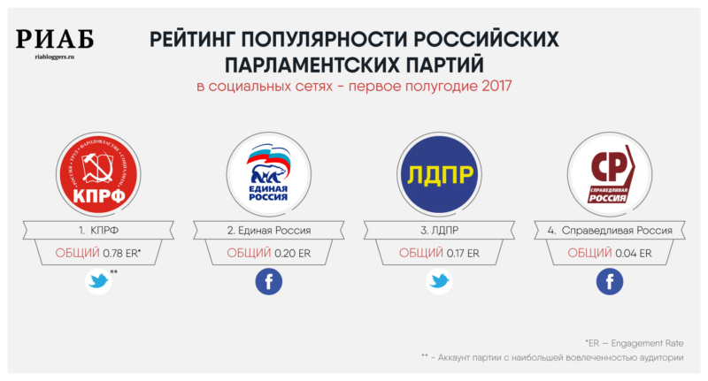 В рейтинг партий лидирует КПРФ с самым высоким ER равным 0,73. За ней следует «Единая Россия»(0,20), ЛДПР (0,17) и «Справедливая Россия» (0,04). У последней, несмотря на то, что она представлена в пяти соцсетях, аудитория не превышает 20 тысяч человек.
