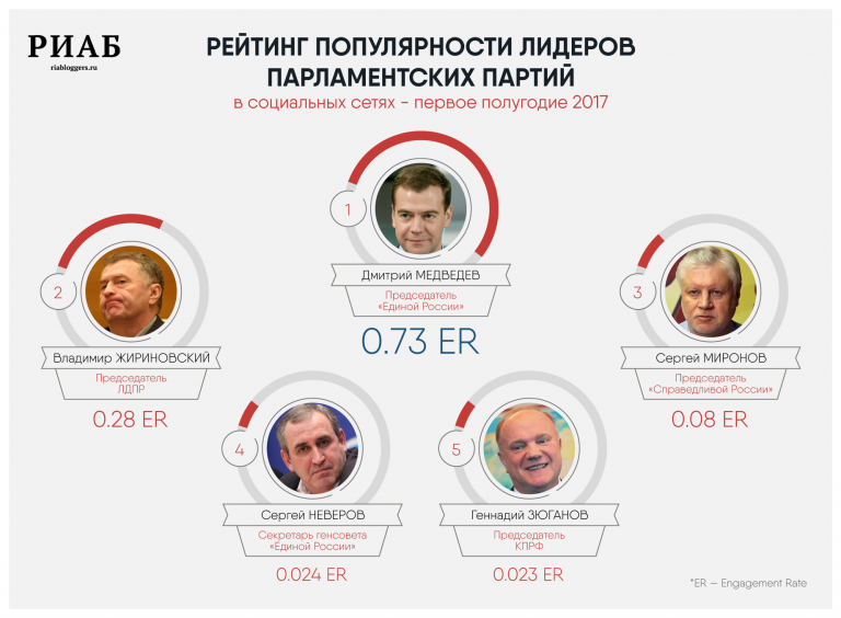 Обратная ситуация у победителя рейтинга партийных лидеров Дмитрия Медведева (показатель ER 0,73). На его страницы в VK, Facebook, Instagram и Twitter подписано более 12 миллионов человек. У занимающего второе место Владимира Жириновского (0,28) аудитория поскромнее – 2,5 млн пользователей. Далее в рейтинге расположились Сергей Миронов (0,08), секретарь Генсовета «Единой России» Сергей Неверов (0,024) и председатель ЦК КПРФ Геннадий Зюганов (0,023).