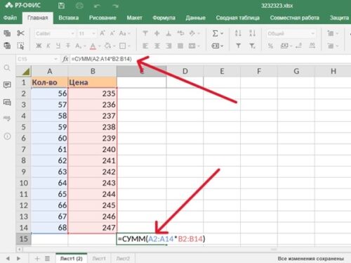 После этого следует в строке формул поставить знак умножения — звездочку и курсором выделить второй диапазон — с ценой. Это ячейки B2-B14. И в конце формулы поставить закрывающую скобку ).