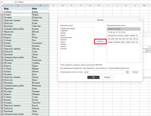Откроется окно «Списки», где вы сможете внести данные в нужном порядке. Заполняйте список, разделяя элементы клавишей Enter или запятой. Для более точной настройки удобно использовать клавишу Alt: зажав ее, выделите пункт и перемещайте его вверх или вниз с помощью стрелок. Когда список будет готов, нажмите «Добавить», чтобы сохранить его. После этого нажмите «Ок».