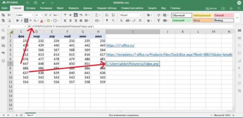 Для вставки активной ссылки на документ, хранящийся на компьютере, следует в менеджере файлов выделить необходимый файл и в верхней панели нажать на кнопку «Скопировать путь». Адрес расположения файла будет скопирован в буфер обмена компьютера. Затем надо перейти в таблицу «Р7-Офис», выделить ячейку, где будет гиперссылка и поставить курсор в строку формул. В этой строке надо написать =ГИПЕРССЫЛКА(. Затем вставить из буфера обмена адрес, закрыть скобку) и нажать на клавишу Enter. В результате в ячейке будет рабочая гиперссылка на документ, расположенный в компьютере.