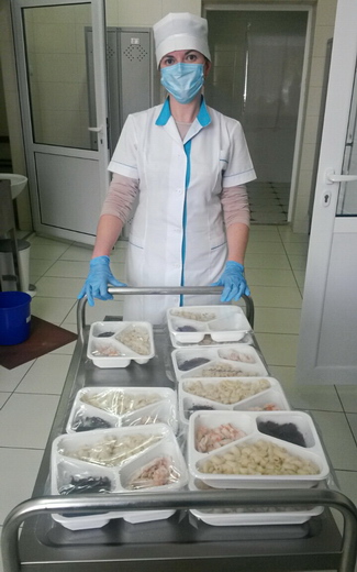 В лечебные учреждения готовые рационы доставляют в специальных боксах, способных поддерживать необходимый для хранения температурный режим. На каждом контейнере обязательно присутствует маркировка сназванием блюда, подробным составом и временем приготовления. Это помогает исключить ошибки в питании пациентов с индивидуальными рекомендациями по диете. Разогревают рационы на больничных пищеблоках в специальных парогенераторах. Далее пациенты получают порции прямо в палаты: завтраки, обеды и ужины сервируются на одноразовых подносах.