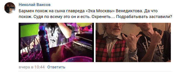 Через некоторое время под записью начали появляться комментарии, в которых пользователи заметили, что тот самый грубиян-бармен ни кто иной, как сын главного редактора «Эха Москвы» Алексея Венедиктова. Он, кстати, в своих эфирах часто порицает экономические преступления, а тут получается, его сын как раз замешан в подобном деле.