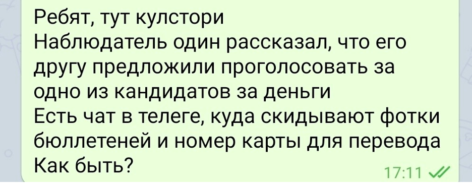 Помимо этого, один из авторов сообщений в чате говорит о том, что они были отправлены не в тот чат, что свидетельствует о том, что чат по скупке голосов не один.
