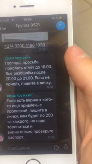 «Если есть вариант кого-то еще привлечь с пропиской, пишите в личку, вам будет по 250 за каждого, но надо торопиться и внимательно проверьте паспорт», — пишет некий Дима Крутских в группе.