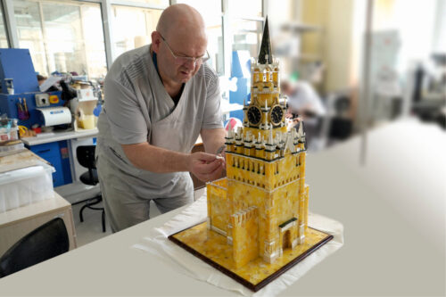 Миниатюрная версия главной башни Московского Кремля выполнена в технике мозаики. Каждый фрагмент был предварительно обработан и подогнан под соседний вручную. Для создания башни потребовалось пять месяцев и 17 кг первосортного матового янтаря. В янтарной версии Спасской башни сохранены мельчайшие архитектурные детали. Арки, шпили и даже знаковые «ласточкины хвосты» на мерлонах выполнены из балтийского камня. С помощью технологии прессования художники изменили оттенок янтаря и передали оригинальные цвета декоративных элементов. Например, подоконники и готический купол у сувенира также зеленые. В звоннице размещены 23 миниатюрных колокола, отлитых из латуни и покрытых серебром. Входная дверь в башню выполнена из настоящего дуба. Икона Спаса Смоленского над входом нарисована вручную. Ее размер – 1,5 на 2 см.