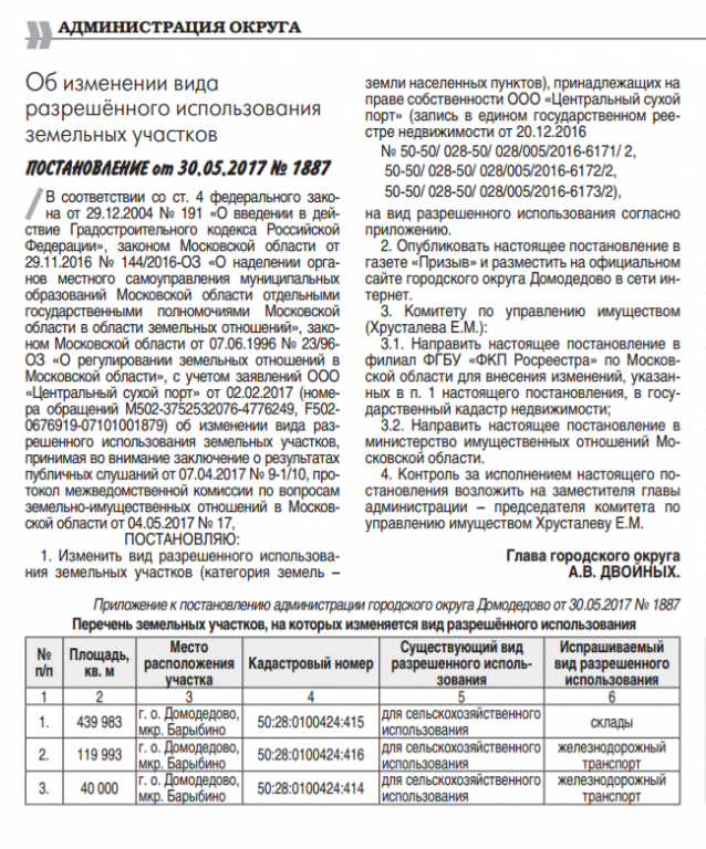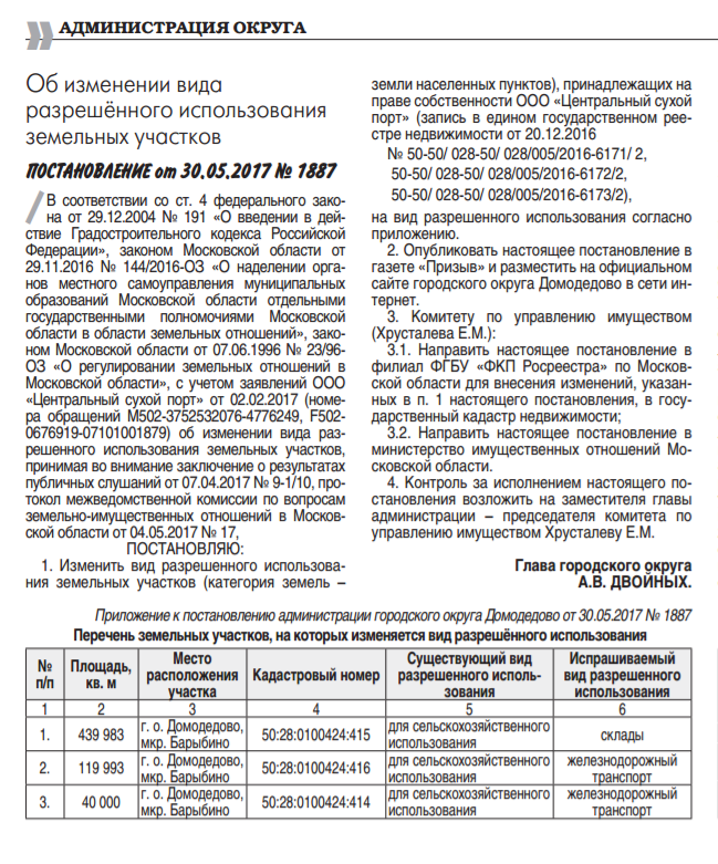 Стоит напомнить, что администрация городского округа Домодедово во главе с Александром Двойных проигнорировала мнение коренных жителей, пошла на двойной подлог и в подозрительно быстрый срок перевела земли из сельскохозяйственного назначения в промышленное.